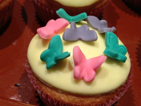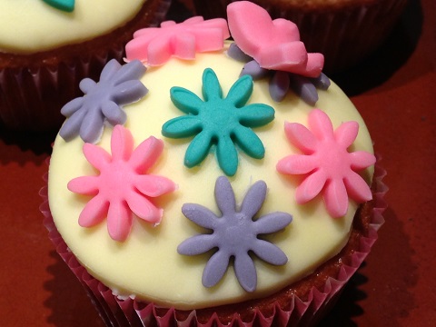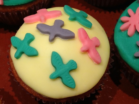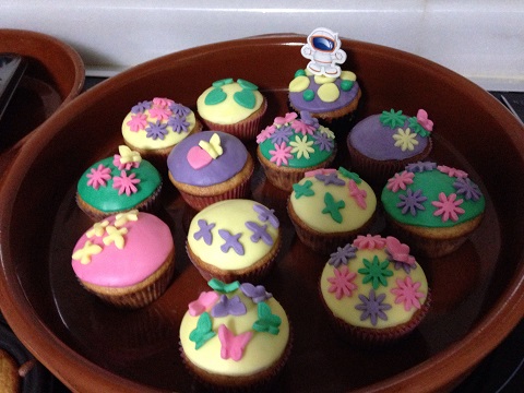 Lo que hicimos fue aplanarlo con el rodillo y sacar con un vaso una fina capa para ir cubriendo todas las magdalenas y luego con la ayuda de los moldes más pequeños fuimos troquelando mariposas, flores, pájaros y corazones y fuimos decorándolas como mejor nos fue pareciendo ¿os gusta como nos quedaron?