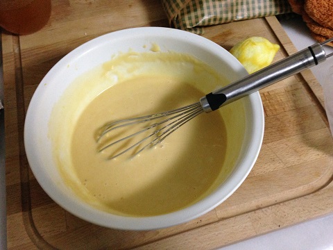 Lo primero, claro, fue hacer las magdalenas. Yo no sé mucho de repostería, únicamente sé hacer bizcocho de limón que he visto hacer a mi madre toda la vida. La receta es mezclar en un bol 3 huevos, un yogurt, una medida del vasito de yogurt de aceite, dos de azúcar, tres de harina, un sobrecito de levadura y rayadura de limón, como véis, muy sencillo.