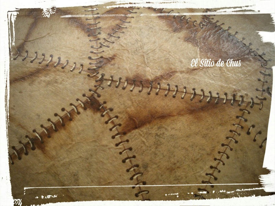 Sólo quedarían las falsas puntadas, que se realizan haciendo con pintura color chocolate dos puntitos y uniéndolos con una rayita un poco curvada. Para darle profundidad a la puntada, le hacemos una rayita más pequeña por debajo de color mantequilla. En esta foto más de cerca lo podéis apreciar mejor.