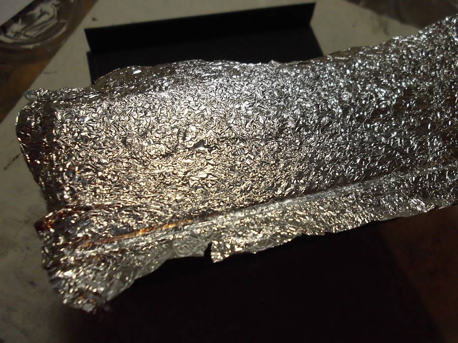 La caja era de cartón negro y me venía genial para intentar experimentar con la técnica de imitación a la plata que se hace con papel de aluminio de cocina.