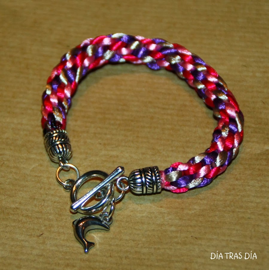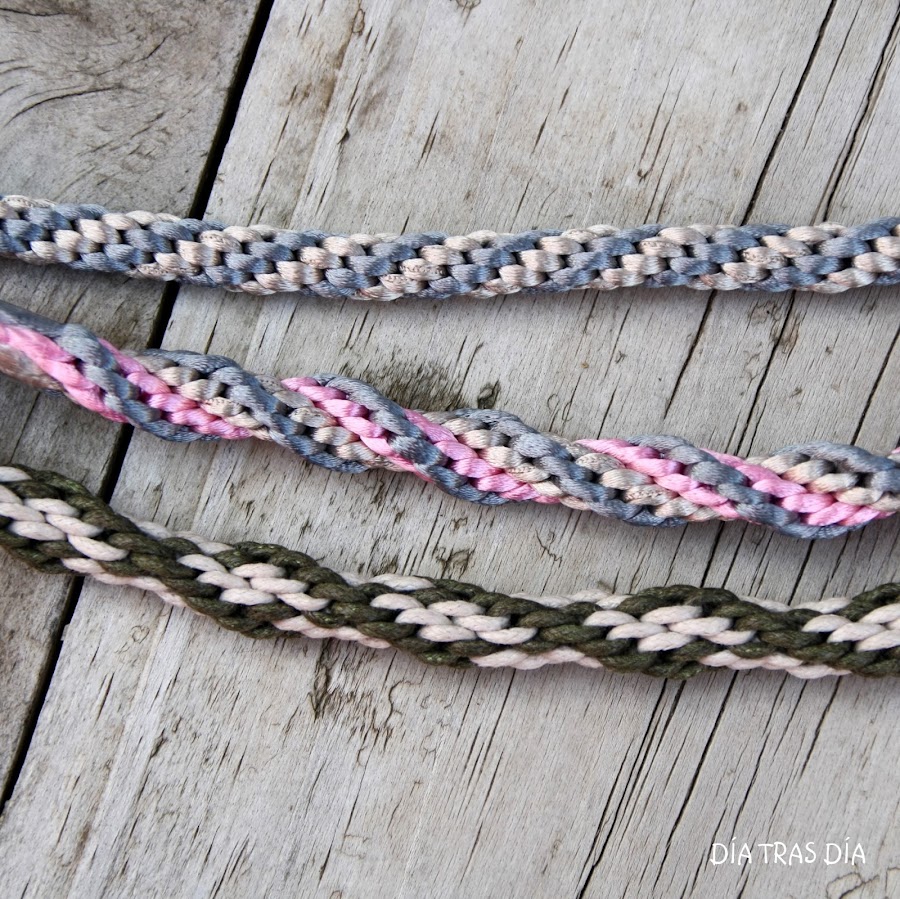 Investigué un poco y me enteré que el disco en cuestión se llama Kumihimo y como podréis suponer, su procedencia es japonesa. Se trata de una técnica en la que se entrelazan los distintos cordones que se colocan en el disco de forma que se pueden hacer infinitas combinaciones.