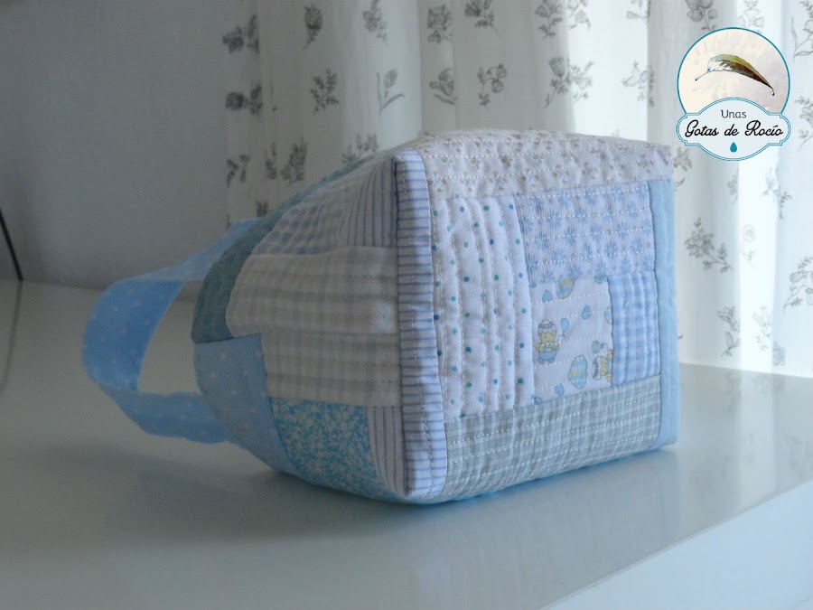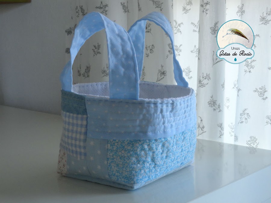 Charo nos enseñó un día la técnica "quilt as you go" y me pareció estupenda. Fácil, rápida y muy resultona, es decir, para mí perfecta. Poco después nos enseñó qué hacer con esa muestra de la técnica y decidí ponerlo todo en práctica. El destino de mi cesta era la habitación de un nene que cumplía un añito, así que escogí telas en tonos azules muy suaves, pues sé que a la mami son los colores que le gustan.