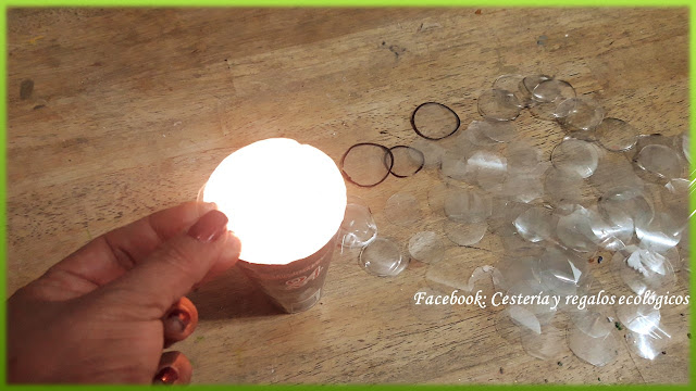 Primero cortamos el tubo de la botella, y sobre el plástico dibujamos 3 círculos de diferente tamaño...