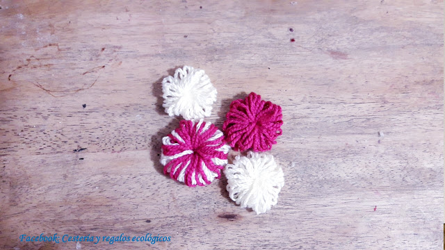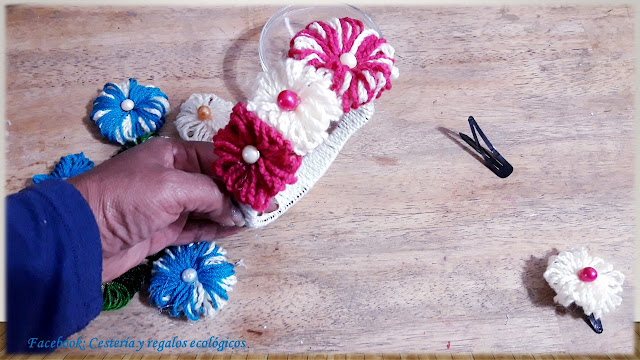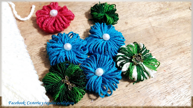 Para decorar el centro de las flores usaremos lo que tengamos: unos lindos botones, falsas perlas o pedrería de pulseras y collares que ya no uses...