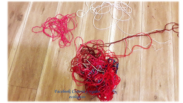Y no necesitas mucho hilo, de hecho, la esfera está elaborada solamente con estos restos de hilos, podemos combinar de diferentes colores en una sola esfera...