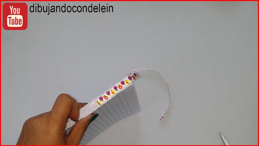 Ahora voy a tomar mas o manos 20 cm de cinta decorada de mas o menos 0.5 cm de ancho, esto es opcional y lo voy a hacer mas que todo para darle un toque decorativo a mi libreta y a la vez me va a servir de marca libro, como les contaba esta cinta en uno de los extremos la vamos a cortar en diagonal y la vamos a sellar con calor.