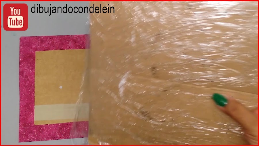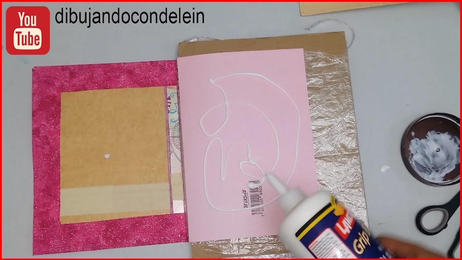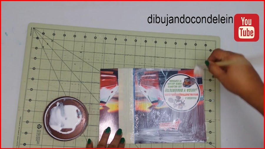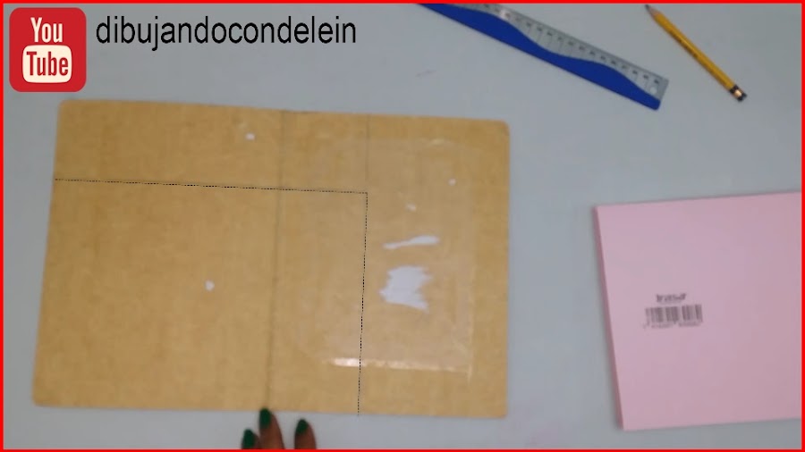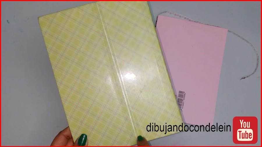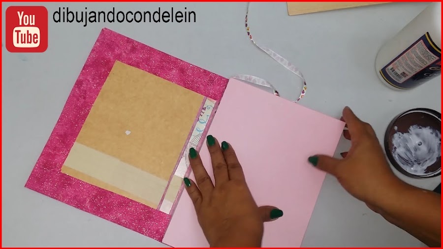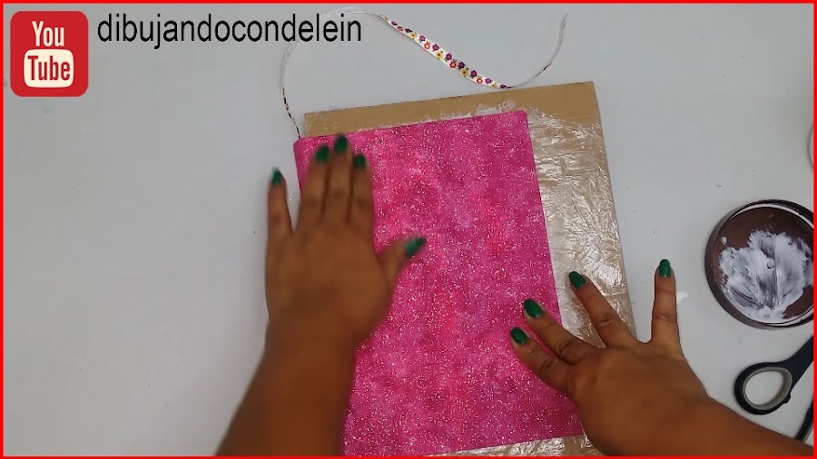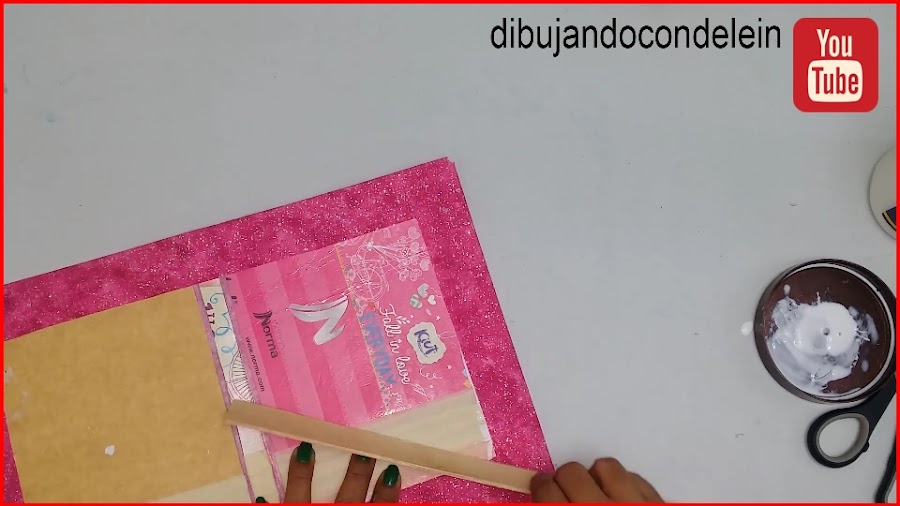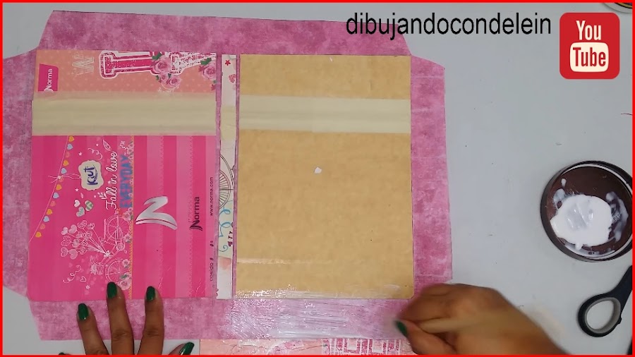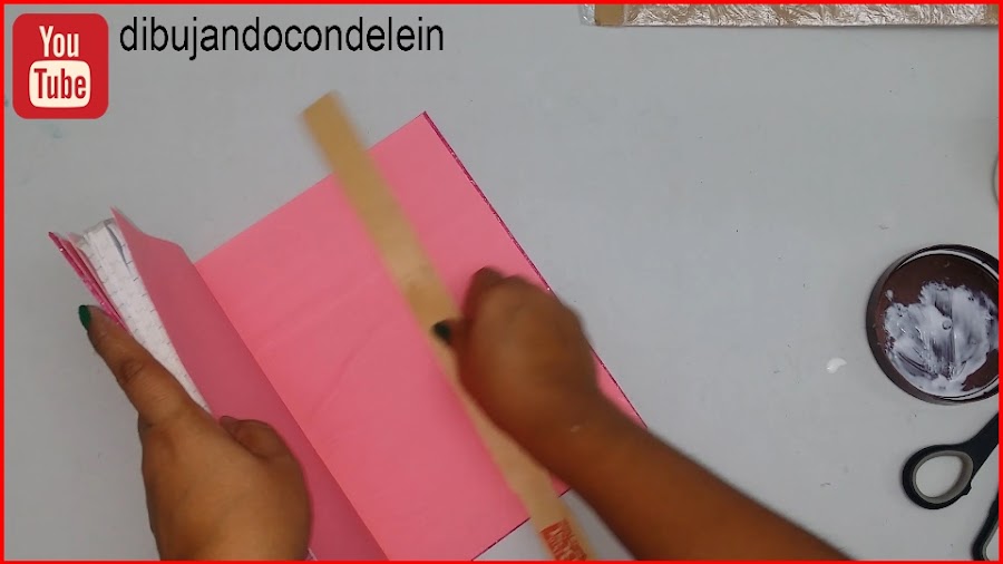 Una vez ya hayamos colocado el pegamento le vamos a colocar la parte interna de nuestra libreta, tal y como se muestra en la imagen, ahora voy a tomar una pieza de carton forrada en plástico que siempre tengo a la mano.