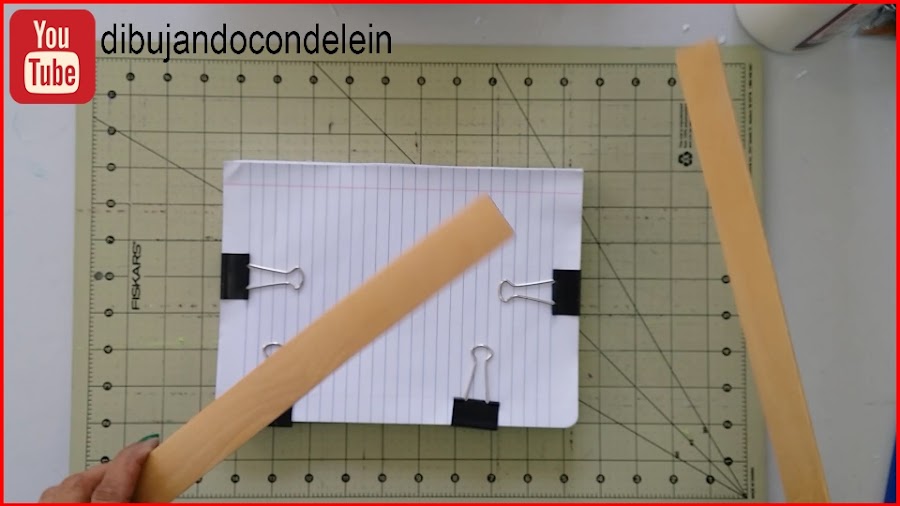 Ahora tomamos las tablillas, yo estoy usando unas paletas que normalmente se utilizan para batir la pintura para pared, con estas tablillas hago una especie de sandwich con las tablillas y las hojas, las aseguro con las pinzas como se muestra en las imágenes.