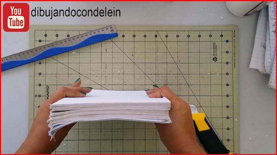 Con la ayuda del exacto o cuchilla cortamos las hojas separando el lado usado del lado que no está usado y lo mismo lo vamos a hacer con todas las libretas que tengamos y vallamos a reciclar.