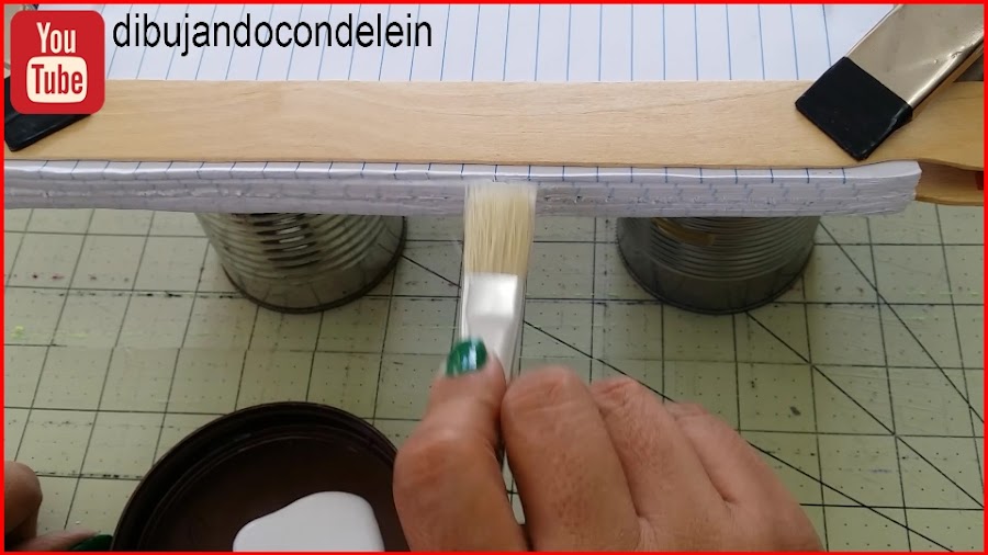 Paso siguiente vamos a aplicar la pega o cola blanca, en éste caso yo me voy a ayudar con un pincel grueso de cerdas duras, también podemos utilizar una brocha pequeña, le vamos a aplicar una capa de pega a todo lo largo del costado, dejamos que esto seque bien , repetimos esto dos veces más (en total ésto lo vamos a hacer 3 veces en total)