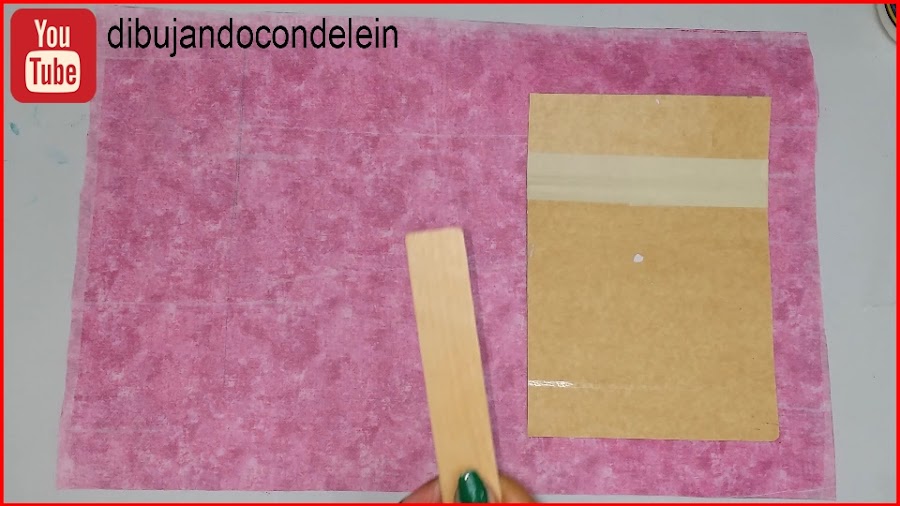 Voy a colocar esta pieza de carton sobre la tela o papel que voy a utilizar fara forrar mi libreta, deben dejar un espacio mas o menos 5cm de distancia en el contorno, luego que coloquemos nuestra pieza con pega en el papel o la tela, vamos a tomar las tablillas que utilizamos anteriormente y vamos a pasarla por el derecho de la tela para asegurarnos que no quede ninguna burbuja de aire, arruga o exceso de pega.