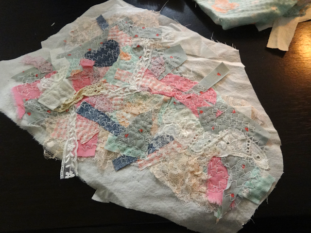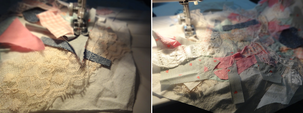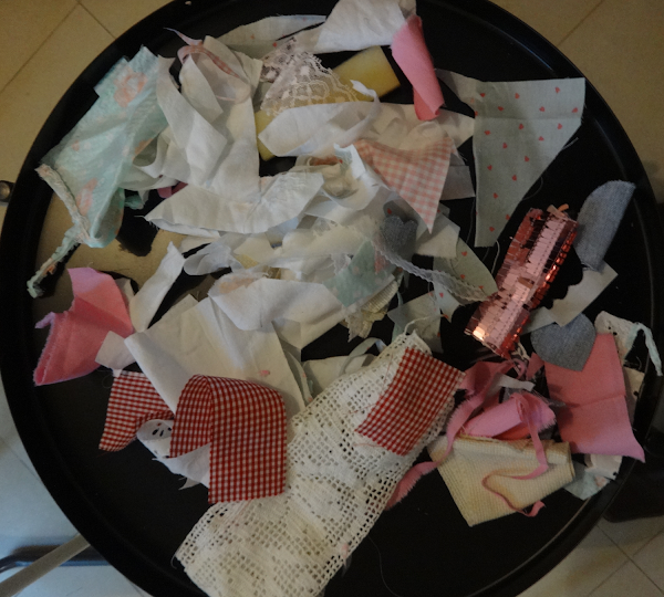 Sobre la tela he colocado los trocitos de tela de forma casual, pero con honestidad es preferible hacerlo teniendo la tela sobre la máquina de coser porque al maniobrar el lienzo hacia la máquina los trocitos se me desparramaron