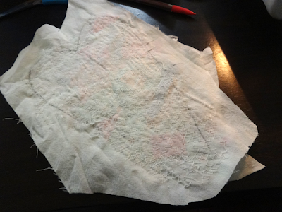 Aquí pueden ver la parte posterior, siempre la muestro porque a veces me gustaría poder observar como queda y frecuentemente se omite este aspecto. Por otra parte se podrán dar cuenta que no he seguido las lineas como indicado en el video, lo que paso es que fui tratando de coser los trocitos de tela al lienzo evitando que quedaran levantados, de esta forma aleatoria también se ve bien bien