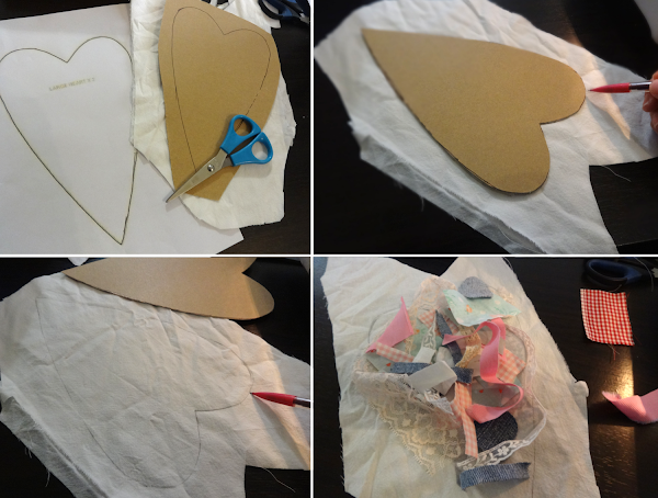 Inicialmente se crea un lienzo usando como base una tela de color claro y sobre ella se colocan las piezas de tela, como quería hacer un solo corazón mi lienzo es más pequeño, forme un molde de corazón que pase al lienzo, dibuje por ambos lados de la tela para visualizar mejor donde debía cubrir con los trocitos de tela