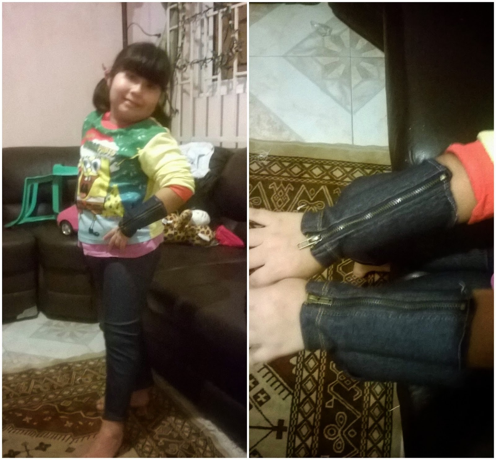 La parte sobrante de este pantalon tenía un par de cierres nuevos y me dije esto queda perfecto como muñequera solamente tuve que ajustar el ancho porque la tela es elástica