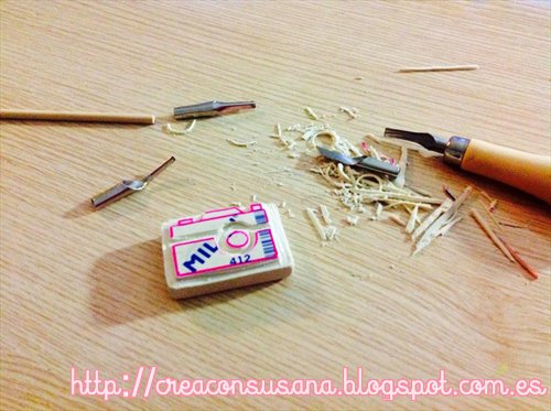Como se trataba de una prueba, lo he carvado en una goma de borrar porque era lo que tenía en casa pero si los queréis hacer mas profesional os aconsejo utilizar la goma especial de carvado.