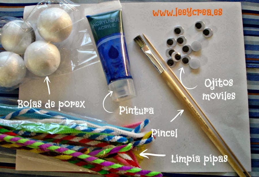 Lo primero que haremos será pintar las bolas de porex; para poder pintarlas bien, utilizaremos un palillo de madera pinchado en la bola. En nuestro caso las hemos pintado de color azul pero podéis elegir el color que más os guste, dejaremos secar las bolas y después les pegaremos los ojitos móviles.