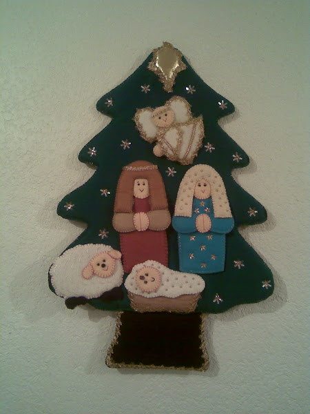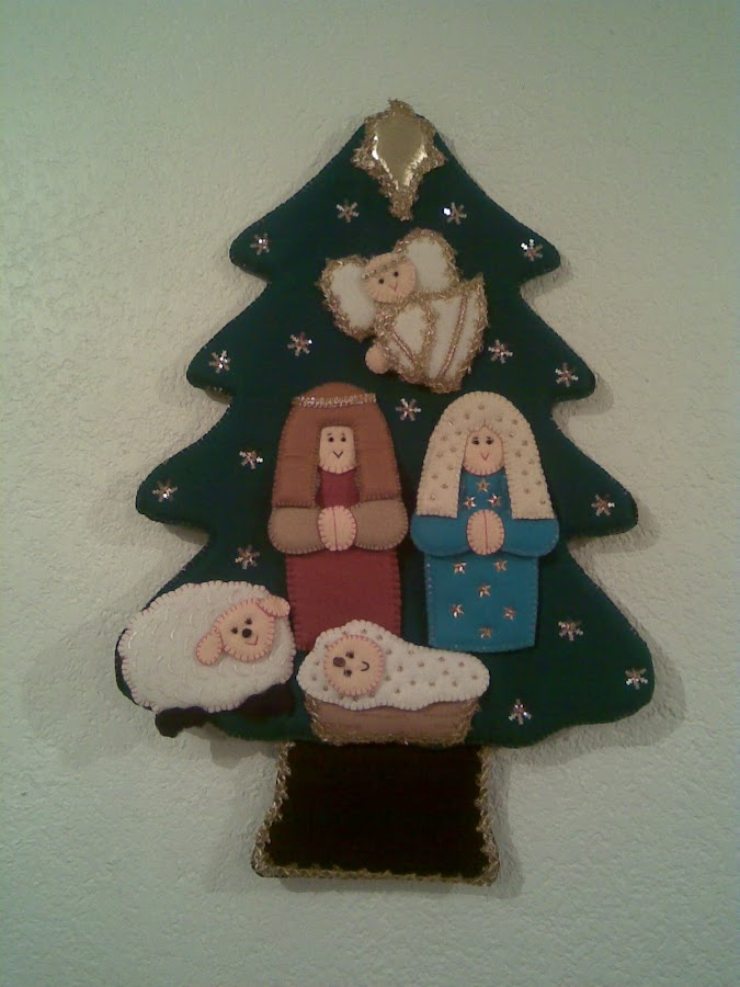 Fieltro, tela dorada metálica, galón dorado, estrellas grandes y pequeñas para aplicar, copos de nieve para decorar árbol, pompones, pintura textil inflable en dorado, chaquirones negros para los ojos de los personajes y yute para el cabello del niño dios.