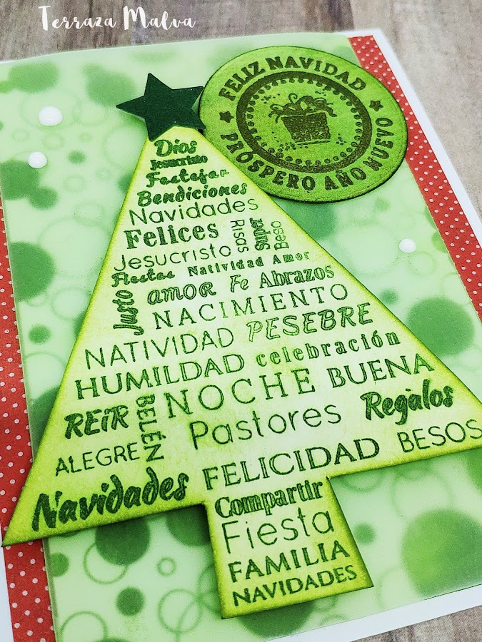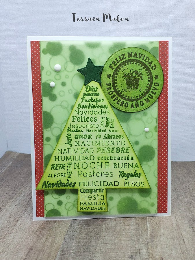 El fondo está formado por dos paneles de cartulina y otro de papel vegetal. El primero es un papel de topos rojo para combinar con el verde del resto de la tarjeta. El panel de burbujas lo he realizado estampando en cartulina blanca y después he superpuesto un papel vegetal tranlúcido para atenuar un poco y que no quitase protagonismo al resto de elementos.