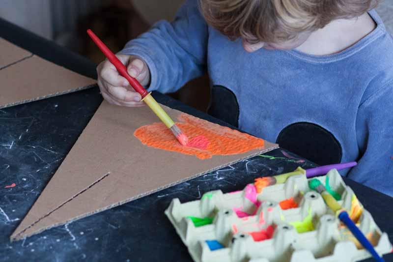 Coged uno de los trozos de cartón y dibujad con un lápiz un triángulo. Las medidas que tienen los nuestros son 35cm de alto y 25cm de base el más grande y 25cm de alto y 18cm de base el más pequeño.
