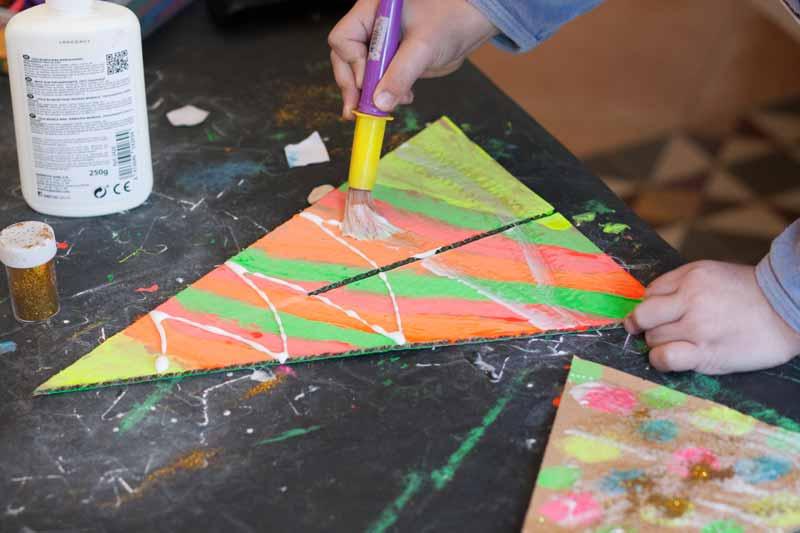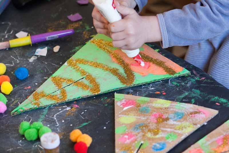 Para decorar con purpurina tendréis que poner cola blanca en las piezas de cartón. Para el efecto espolvoreado simplemente repartid la cola con un pincel por toda la pieza. Si lo que queréis es trazar lineas o hacer formas tendréis que poner la cola y repartirla dibujando la forma que queráis. Por ejemplo, para nuestro árbol con el efecto de espumillón hemos puesto la cola formando un zigzag y hemos echado una cantidad generosa de purpurina justo por la linea de cola.