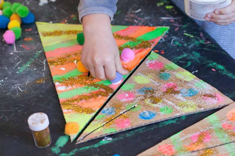 La purpurina la podéis usar de diferentes formas, bien espolvoreándola por encima de forma que quede uniforme por toda la pieza de cartón o trazando formas. Nosotros hemos hecho las dos cosas, una+o de los árboles de navidad lo hemos decorado espolvoreando la purpurina y el en otro hemos hecho como una cenefa que se asemeja al espumillón que se coloca en los árboles de navidad.