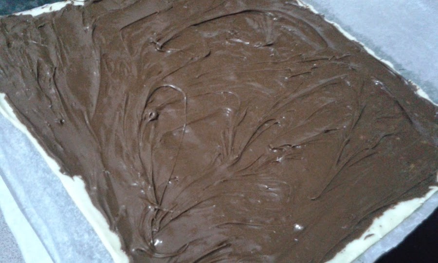 Sólo tienes que desplegar una de las láminas y untarla generosamente con la crema de chocolate. Una cucharadita para el hojaldre... una para mí... una para el hojaldre y otra para mí... ves? es fácil!
