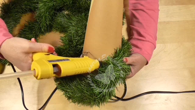 Le pegaremos un espumillón de color verde simulando el follaje del árbol y lo haremos con silicona caliente.