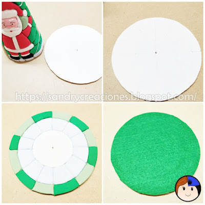 Una vez terminado el árbol, realizamos una base utilizando cartón pluma, el cual cubrimos de trozos de tela, utilizando la misma técnica, pero solo la parte que quedará a la vista una vez pegado el árbol en el centro. Como el cartón pluma es más delgado que el porexpan tenéis que tener especial cuidado de no ir muy profundo con el cúter para que no se rompa, o bien, hacer la base con doble capa de cartón pluma. Para finalizar la base pegamos un trozo de fieltro de color verde de la misma forma por su parte inferior.
