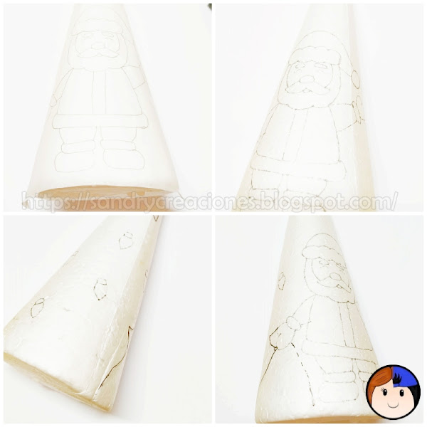 Para empezar con el árbol lo primero que hacemos es pensar el diseño que queremos realizar en su superficie y una vez decidido pasarlo en el cono de porexpan con la ayuda de papel de calco o dibujando directamente sobre el porexpan y después remarcar todas las líneas del dibujo con un cúter.