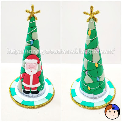 Seguidamente pegamos el árbol a la base con silicona caliente, le damos los últimos toques realizando una estrella y decorando el contorno de la base y del árbol con limpiapipas y ya tenemos nuestro árbol listo.
