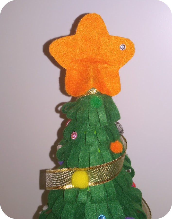 Acabar la punta del árbol. Yo opté por recortar dos estrellas de fieltro y pegarlas una contra la otra con pistola de pegamento caliente cogiendo la punta en medio. Queda duro suficiente para que no se doble.Y después de todos estos pasos y un poquito de imaginación así es como ha quedado el árbol de Navidad. ¡A mi me gusta mucho!