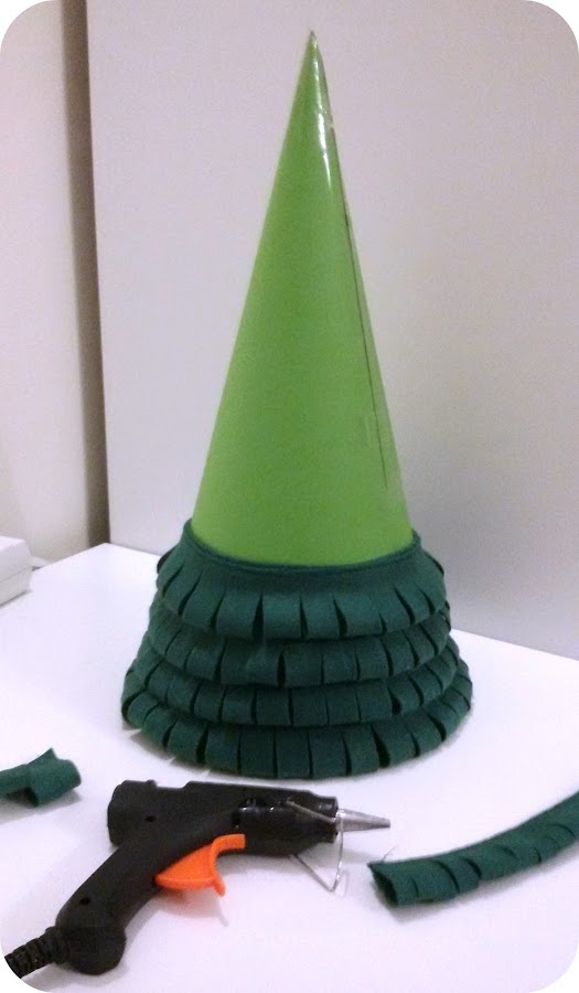 Antes de poner las últimas tiras de fieltro, en la punta hice un cono de fieltro y lo pegué con la pistola de pegamento caliente.