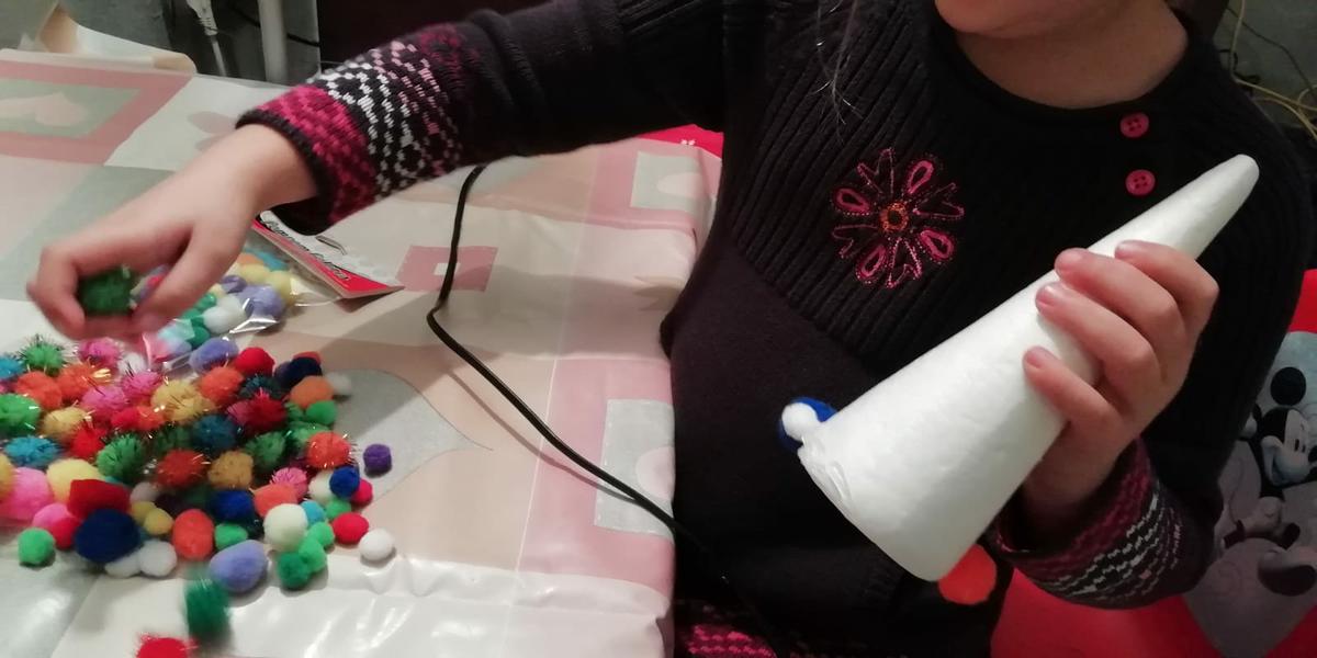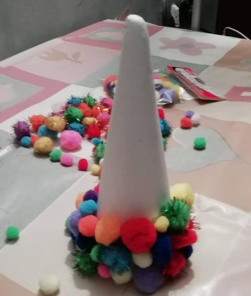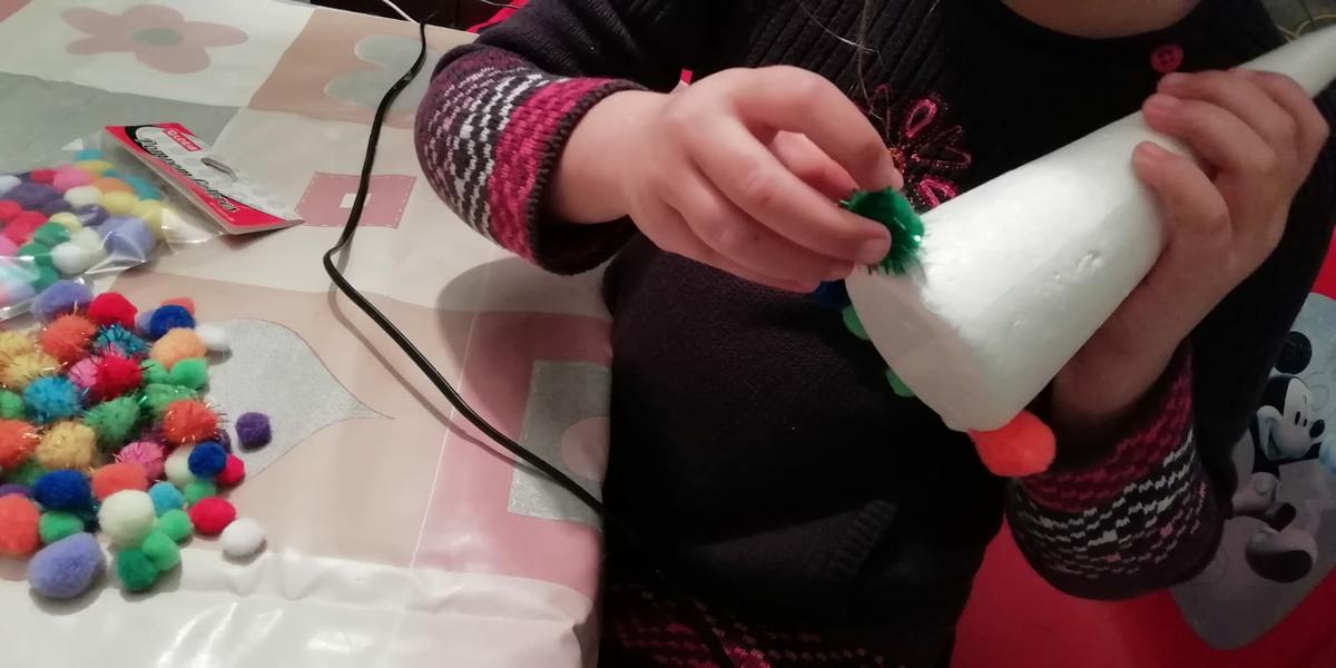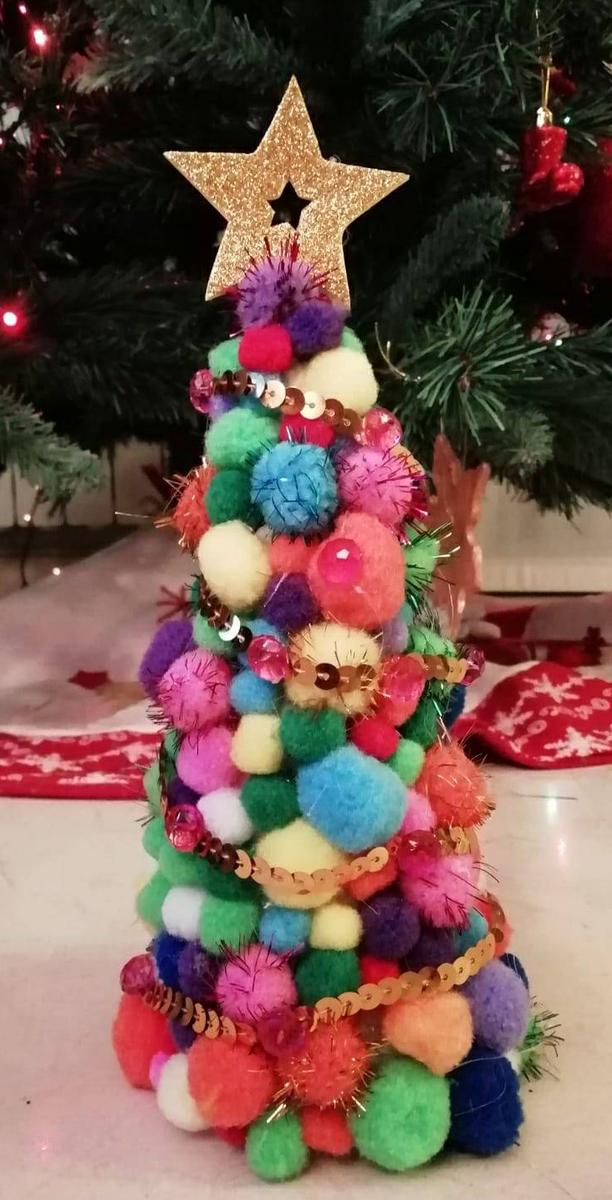 Sólo hay que ir enganchando los pompones en filas uno al lado del otro. El tamaño y color da igual, lo importante es que quede todo cubierto y no se vea ningún claro blanco. Luego se pone alrededor la tira de lentejuelas (o la que hayáis elegido) y, finalmente la estrella en la punta del árbol.