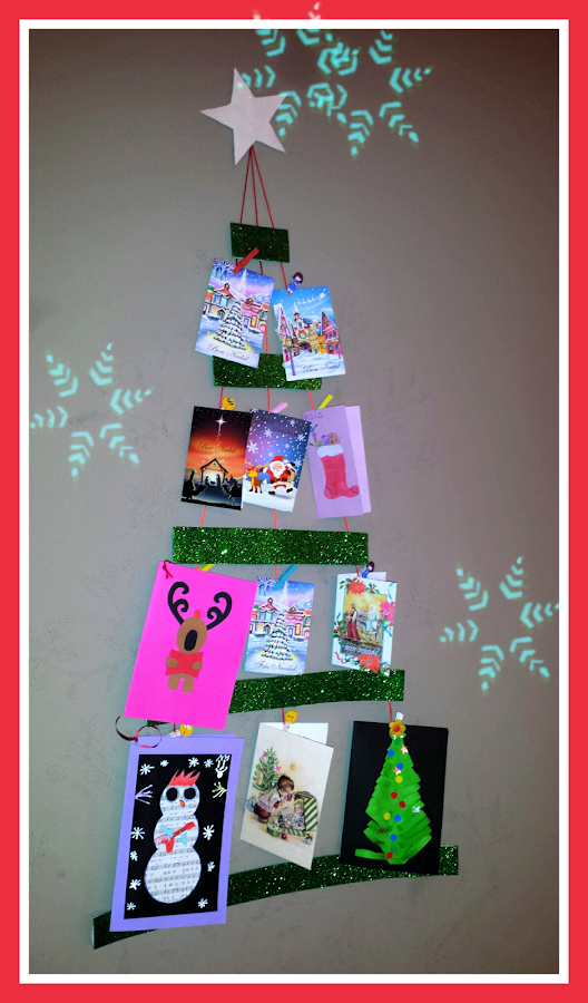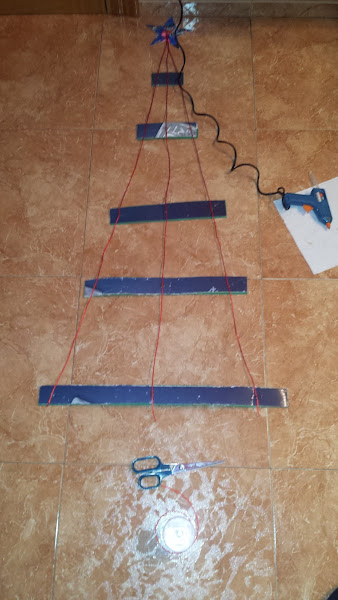 3) Se colocan en una superficie grande (yo el suelo) los rectángulos y la estrella haciendo la forma del árbol como en la imagen de abajo