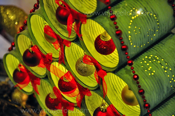 Le pegamos unas cintas doradas a la base y un lazo. Lo adornamos también con una tira de bolitas rojas facetadas dando la vuelta a todo el árbol, se le dio dos vueltas y fijamos en los extremos con un poco de silicona.