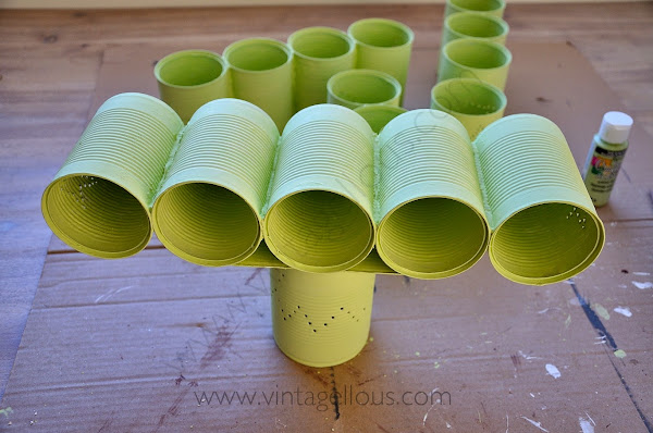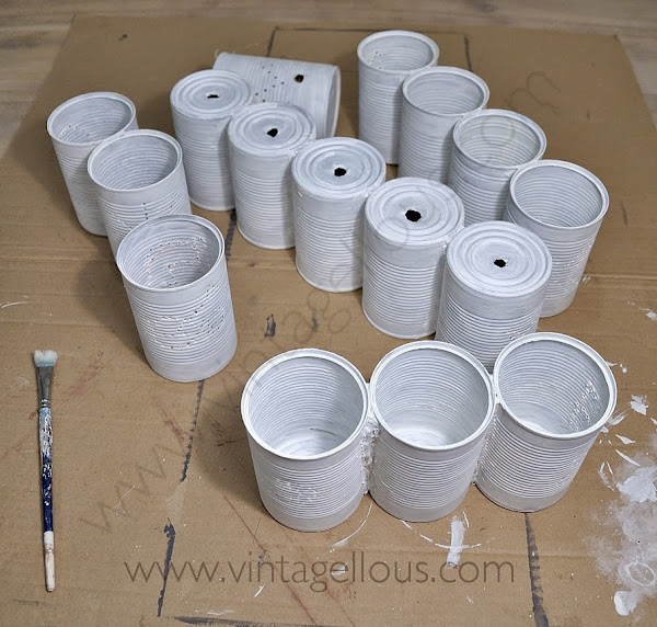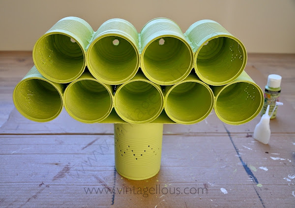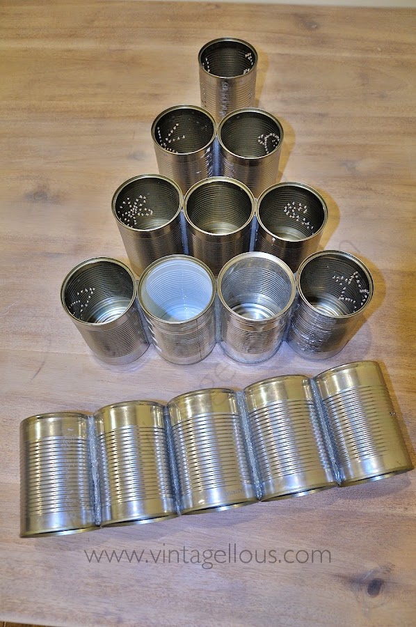 Se pegaron en filas de 5, 4, 3 y 2 teniendo en cuenta las latas taladradas que van en los extremos. No continuamos uniéndolas todas para poder pintarlas más cómodamente en bloques.