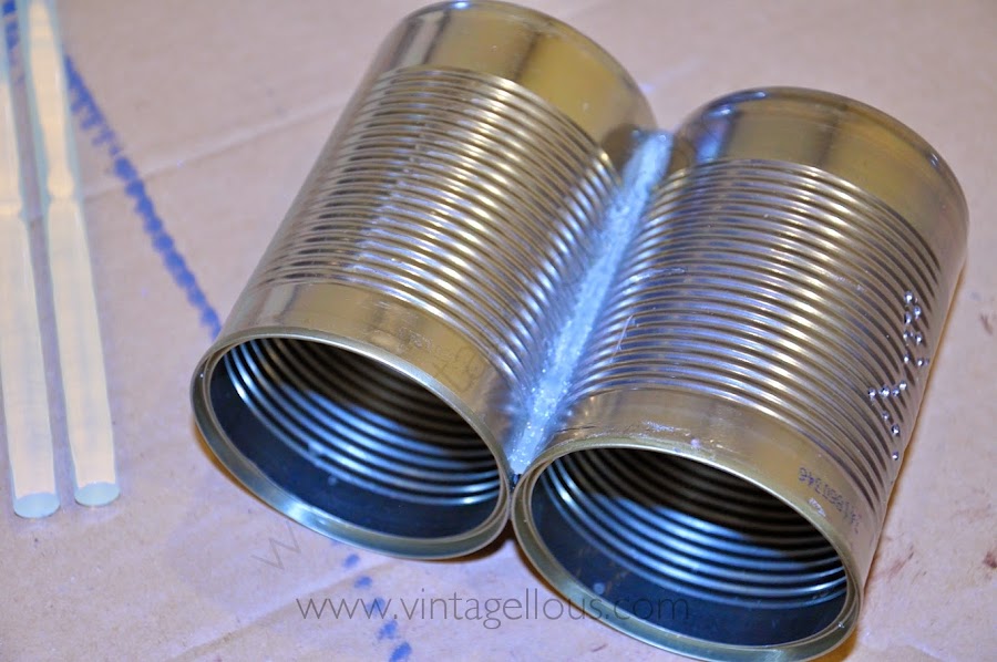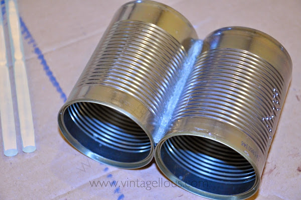 Ahora comenzamos a unir las latas con silicona caliente, las colocamos sobre la mesa para que al pegarse queden todas rectas.