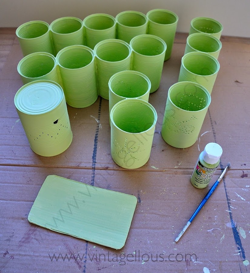 Con un punzón se le hicieron agujeros formando diferentes motivos navideños, para que se iluminen con las luces que le vamos a poner. También puedes perforar las latas con un clavo y un martillo. Pintas sobre la lata el dibujo y comienzas a taladrar. Si no os veis capaces de dibujarlo podéis imprimir dibujos para pegarlos a la lata con cinta adhesiva y taladrar sobre el papel.