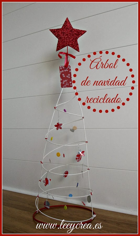 Solo falta colgar nuestros adornos y rematarlo con nuestra estrella. También le puedes colgar en la punta una tarjeta con un lazo como hemos hecho nosotros.