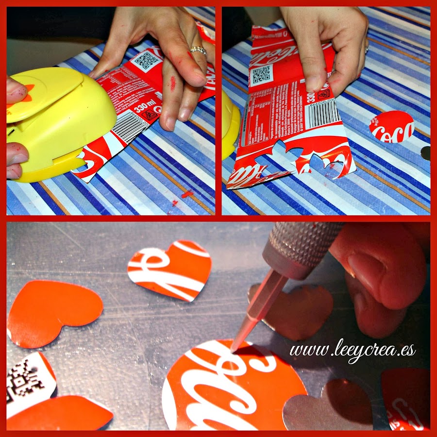 A continuación cogemos los botes de refrescos y los cortamos dejando unas láminas, luego vamos a cortar con las perforadoras esas láminas. Cogemos un punzón y hacemos un pequeño agujero para colgarlos de nuestro árbol reciclado.