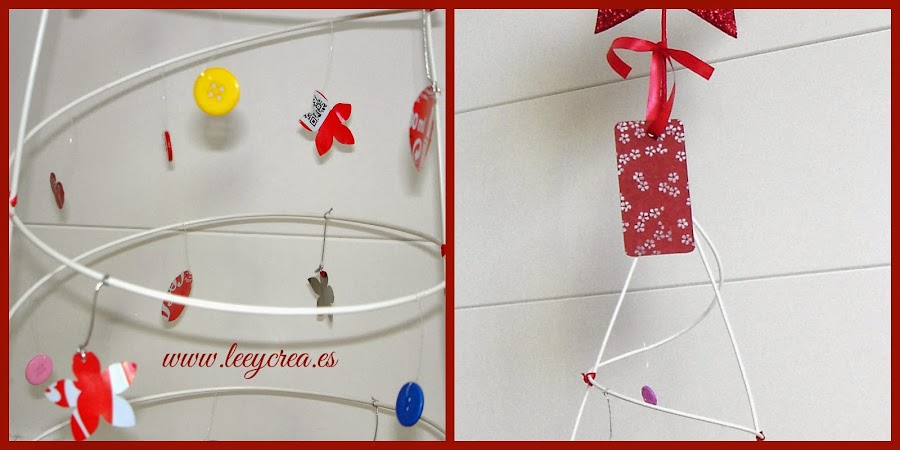 Perforadoras, pintura roja, cinta roja, purpurina y sedal.