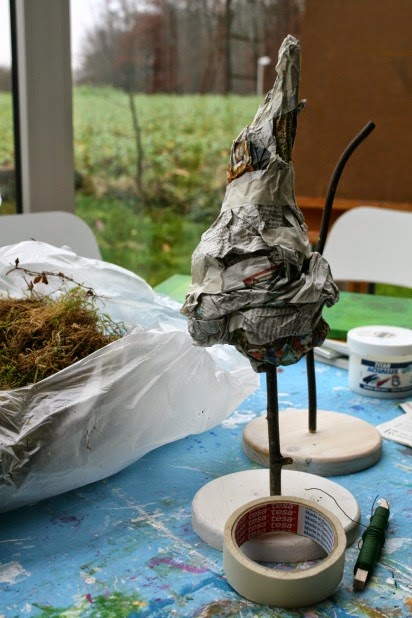 Se fija el tronquito en la base y se da la forma de un arbolito con el papel periódico y la cinta. No debe ser perfecto, en la imperfección radica su belleza!