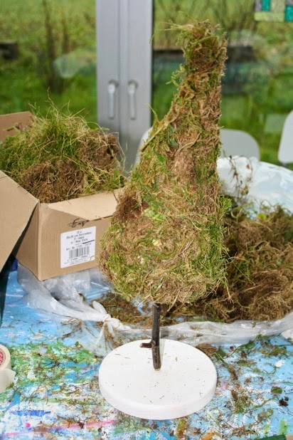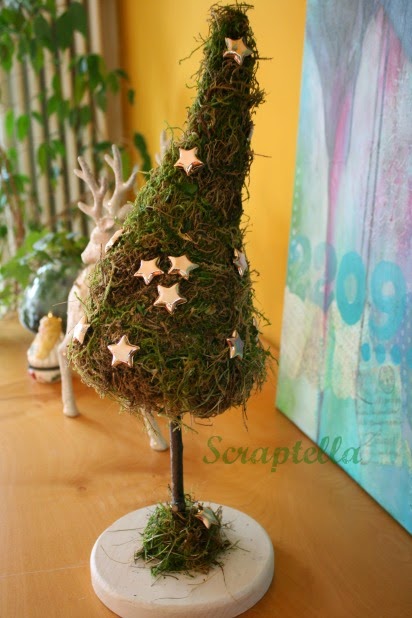 Con la ayuda del alambre se va fijando el musgo, hasta cubrir todo el "árbol" dándo vueltas alrededor de él. Listo! ahora a adornarlo! yo lo quería "torcidito" y con poco adorno, asi que sólo le he pegado estrellitas con silicona caliente.