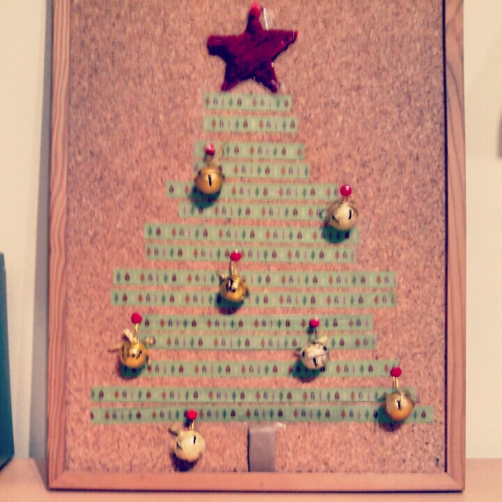 Necesitaremos washi tape en tonos verdes, lana, cartón, cascabeles o adornos navideños y una superficie donde hacer nuestro árbol, en este caso es un corcho pero puede ser un espejo, una cartulina, una pared...