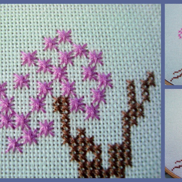 Escogí hilos en tonos pasteles, rosas, celestes y lilas. Ya vamos a ver como irá a quedar... Bien, acá les muestro las 2 primeras etapas. El tronco en nuestro estimado punto cruz y las primeras hojas en punto smirna.