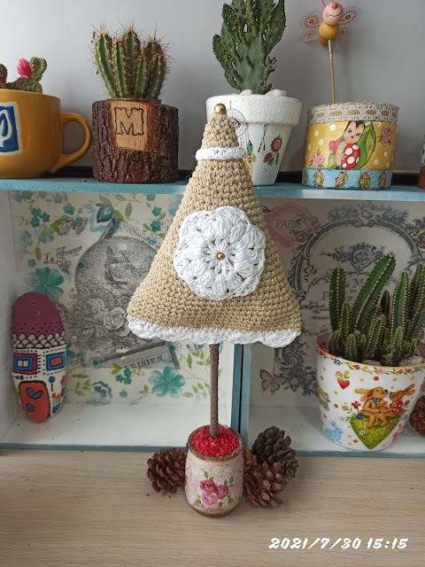 Un arbol de ganchillo, la base es de un yogur de cristal