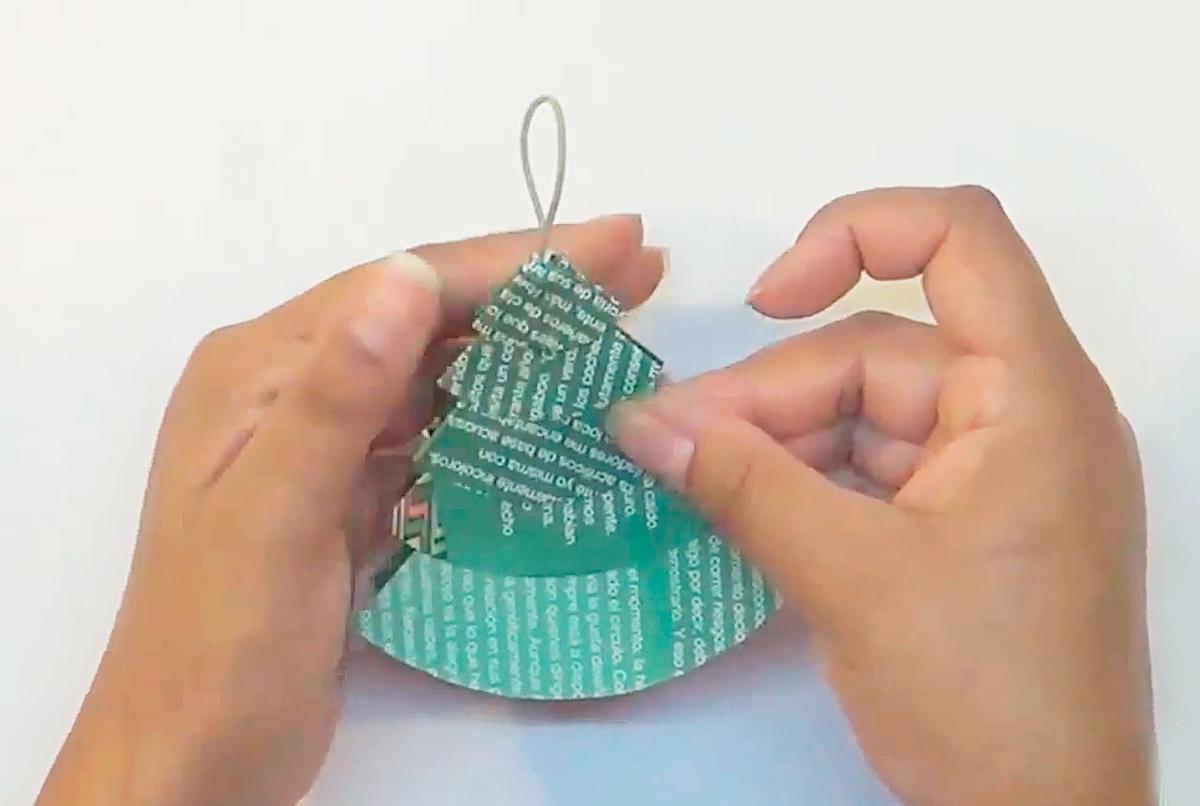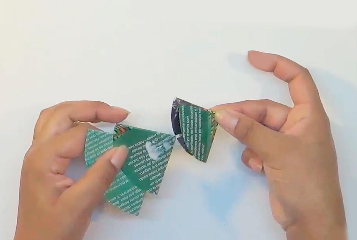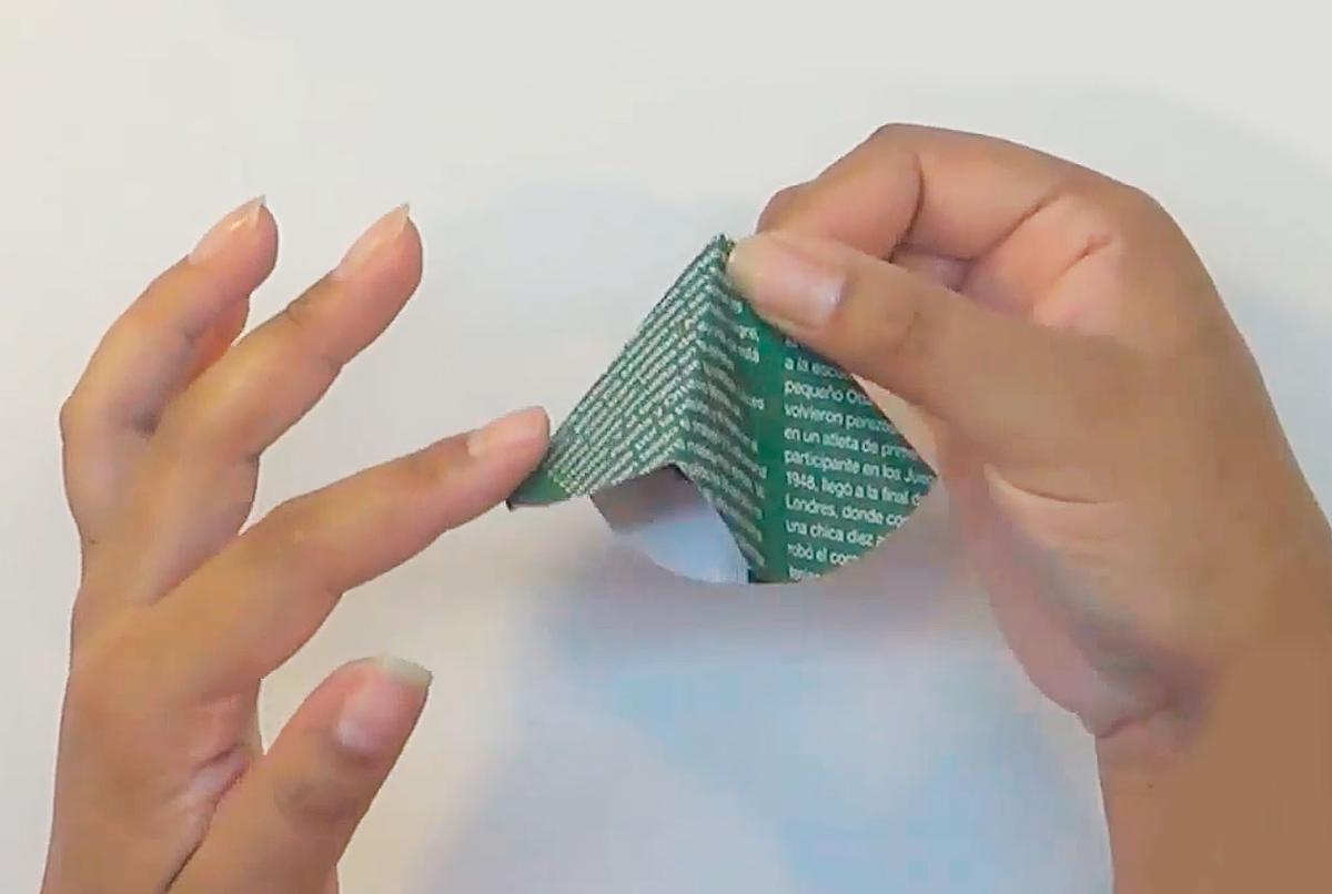 Tan sólo con papel de color verde, el que tú quieras, yo usé papel de revista, por eso puedes ver letras, pero esa es la idea, que se vea que es reciclado.