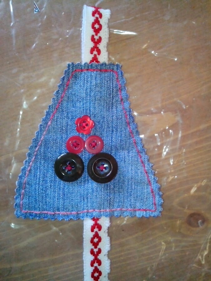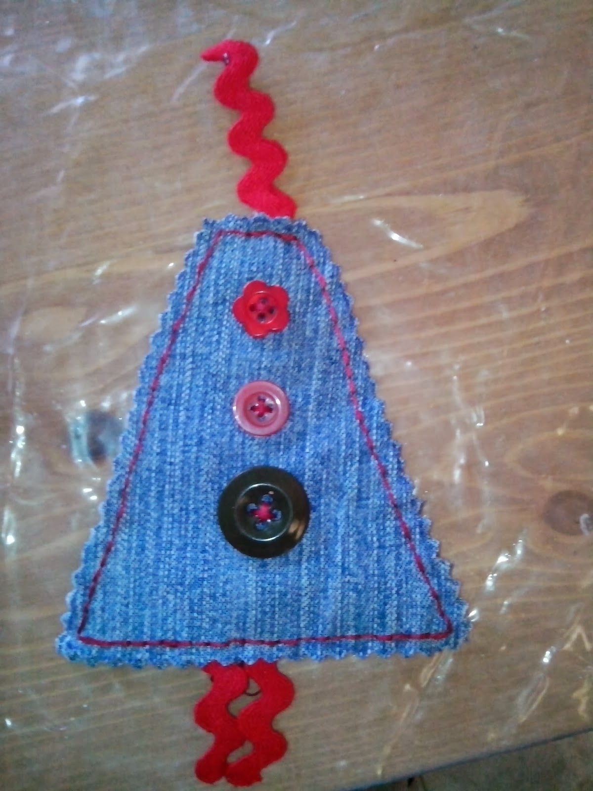 No sólo van a ser bolas los adornos. Esta vez hemos mezclado la tela vaquera, muy actual y juvenil, con botones para hacer estos adornitos para nuestro árbol.
