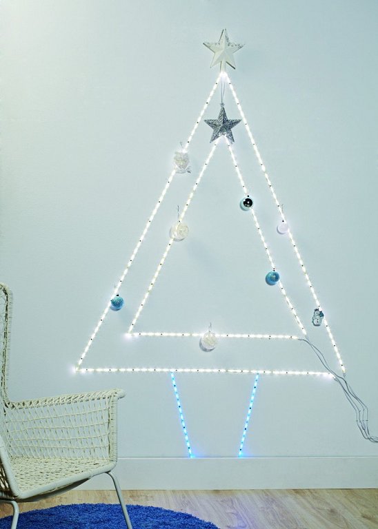Ahora que las luces LED son tan fáciles de conseguir y se encuentra tanta variedad en el mercado, esta idea es súper original y sencilla. Se trata de dibujar en la pared la forma del árbol y decorarlo con unos cuantos adornos, no hace falta mucho más, las luces harán el resto.